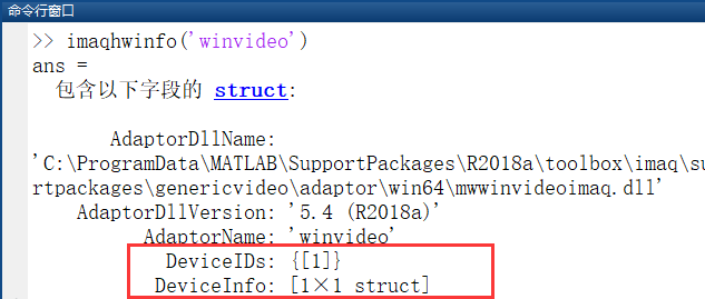 输入imaqhwinfo(‘winvideo’),查看该适配器下所有设备