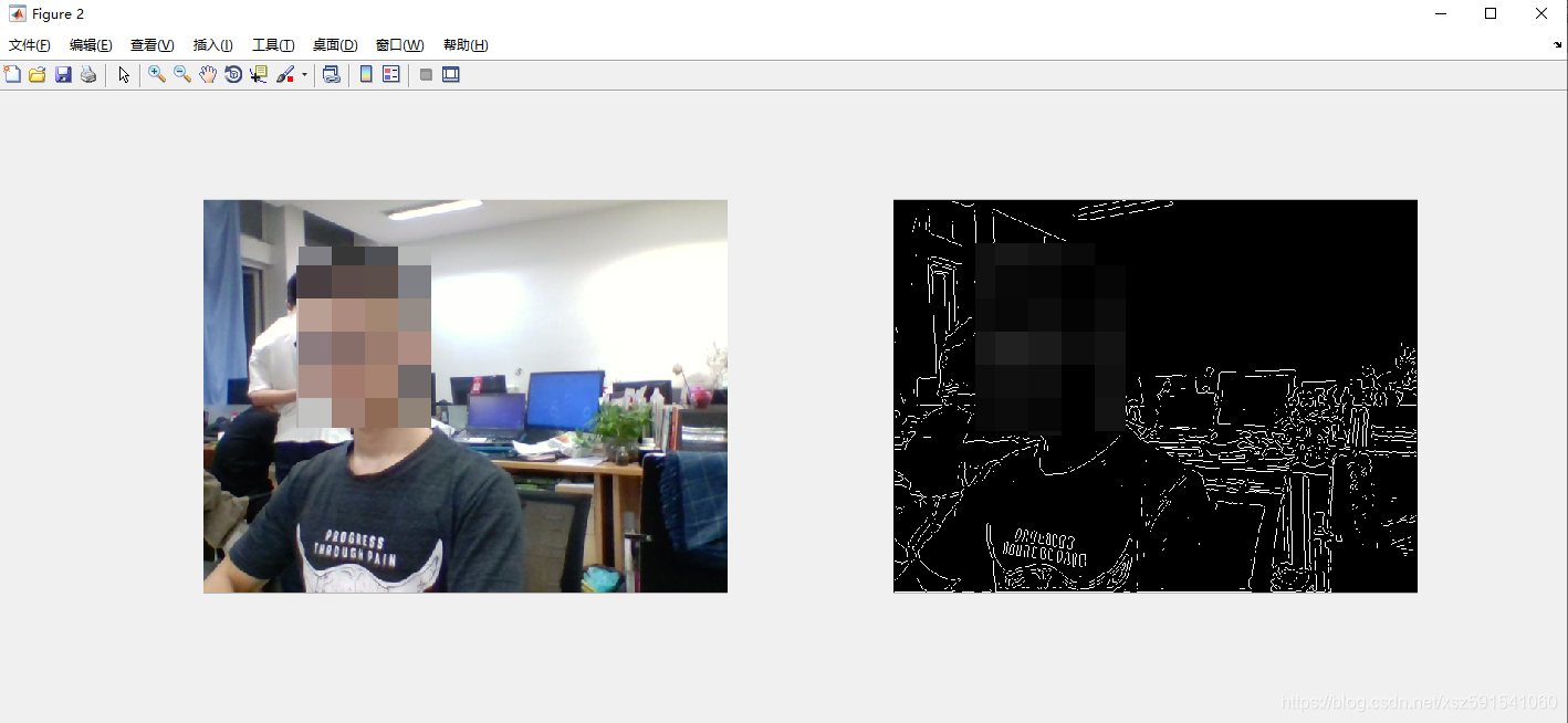 figure while ishandle(h) frame = getsnapshot(obj); % 获取帧 % -----------此处可添加你需要的操作------------ imedge = edge(rgb2gray(imedge),'log') % 计算log边缘 % ------------------------------------------- subplot(121),imshow(frame) subplot(122),imshow(imedge) drawnow end 效果图如下(由于太懒没有制作动图,仅截图示意,大家可自行测试)
