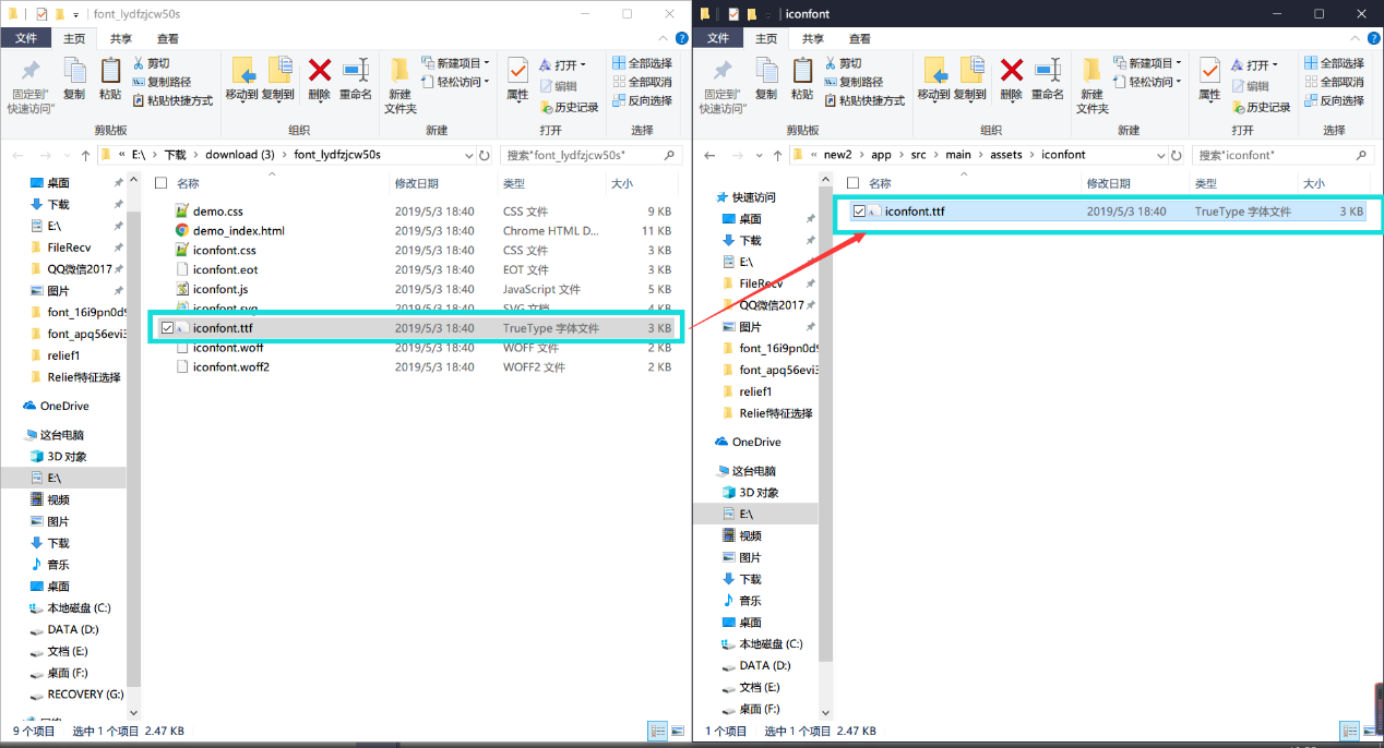 第一步:从iconfont平台选择要使用到的图标,并下载至本地;复制字体文件到项目 assets Ŀ¼