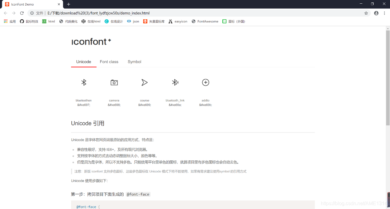 第二步:打开从iconfont平台下载下来的文件,并在目录中打开demo.html,找到图标相对应的 HTML 实体字符码;