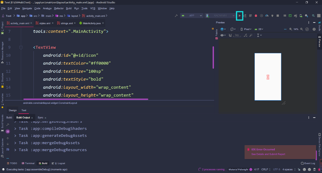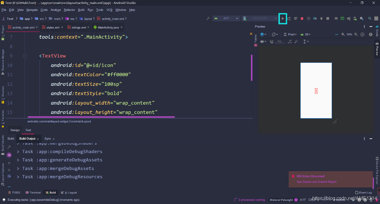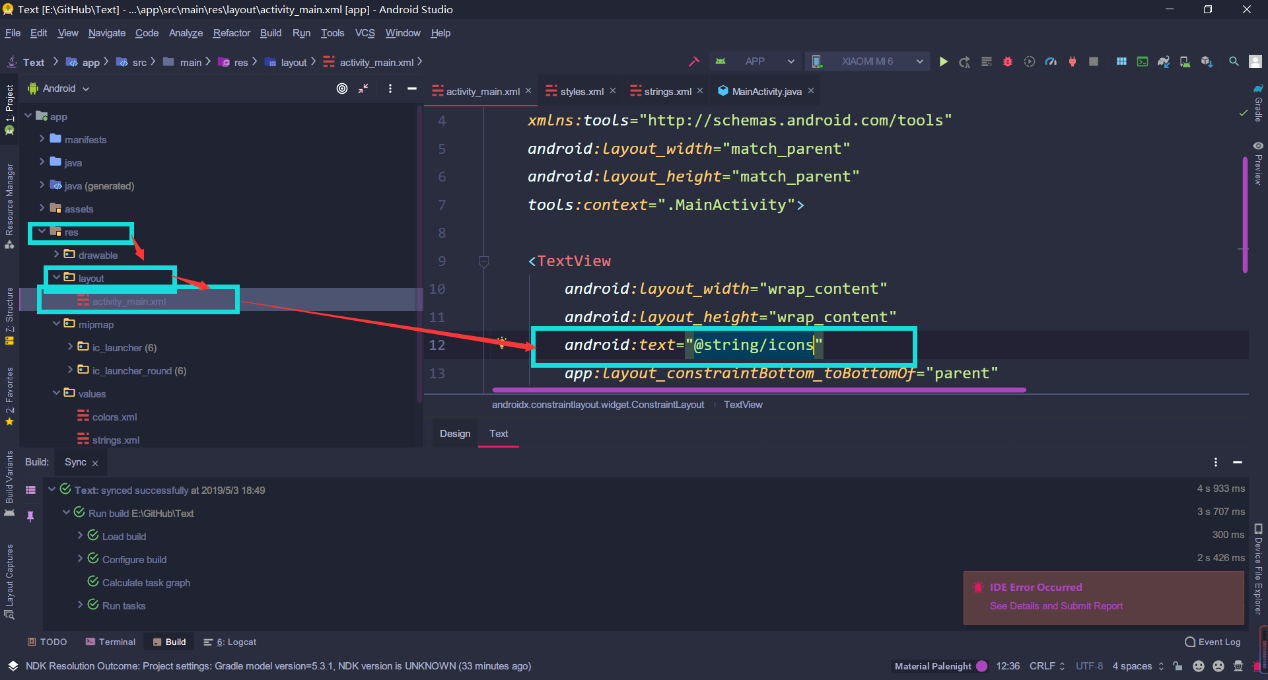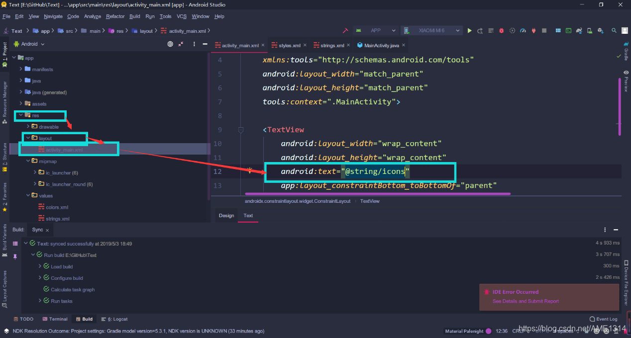 - 打开 activity_main.xml,添加 string 值到 TextView