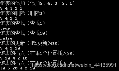 public class LinkList { public static void main(String[] args) { NodeManager nm = new NodeManager(); System.out.println("链表的添加(添加5、4、3、2、1)"); nm.add(5); nm.add(4); nm.add(3); nm.add(2); nm.add(1); nm.print(); System.out.println("链表的删除(删除3)"); nm.delNode(3); nm.print(); System.out.println("链表的查找(查找1)"); System.out.println(nm.findNode(1)); System.out.println("链表的查找(查找10)"); System.out.println(nm.findNode(10)); System.out.println("链表的更新(把1更新为10)"); nm.updateNode(1, 10); nm.print(); System.out.println("链表的插入(在第1个位置插入20)"); nm.insert(1, 20); nm.print(); System.out.println("链表的插入(在第0个位置插入30)"); nm.insert(0, 30); nm.print(); } } 将代码编译、运行,结果如下图: