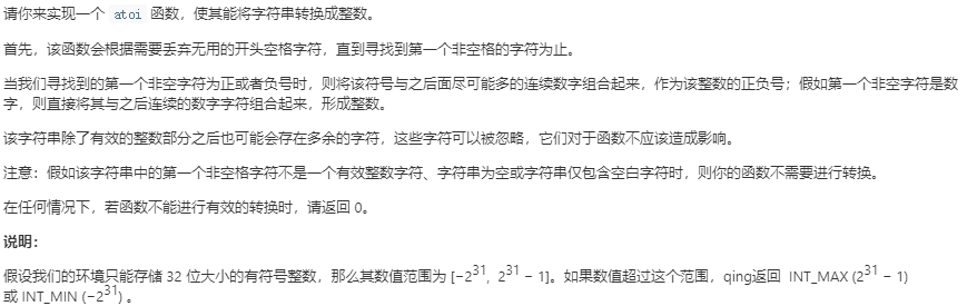 int myAtoi(string str) { int start=0,i=0; long long val=0; if(str.empty()) return 0; //先找起点 while(i<str.size() && str[i]==' ') ++i; start=i; //找终点 if(str[i]=='+' || str[i]=='-' || isdigit(str[i])){ ++i; while(i<str.size() && isdigit(str[i])) ++i; } else return 0; if(str[start]=='-'){ ++start; for(;start<i;++start){ val = val*10-(str[start]-'0'); if(val<=INT_MIN) return INT_MIN; } return val; } else if(str[start]=='+'){ ++start; for(;start<i;++start){ val = val*10+(str[start]-'0'); if(val>=INT_MAX) return INT_MAX; } return val; } else{ for(;start<i;++start){ val = val*10+(str[start]-'0'); if(val>=INT_MAX) return INT_MAX; } return val; } } 文章来源: https://blog.csdn.net/Zolewit/article/details/89842642