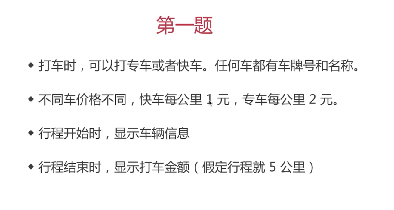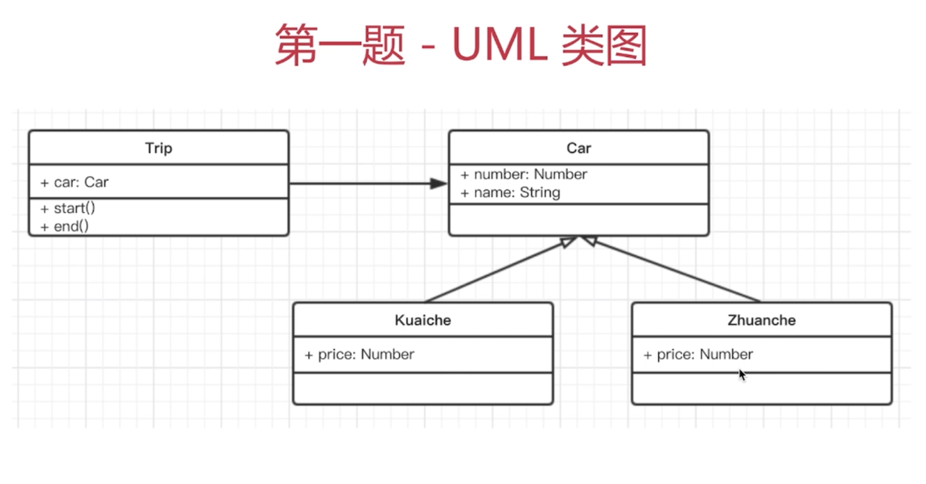 class Car { constructor(number, name) { this.number = number this.name = name } } class Kuaiche extends Car { constructor(number, name) { super(number, name) this.price = 1 } } class Zhuanche extends Car { constructor (number, name) { super(number, name) this.price = 2 } } class Trip { constructor(car) { this.car = car } start () { console.log(`开始行程,显示车辆信息:号码->${this.car.number},车名->${this.car.name}`) } end () { console.log(`结束行程,显示金额:${this.car.price * 5}`) } } let car = new Kuaiche(110, '本田') let trip = new Trip(car) trip.start() trip.end()