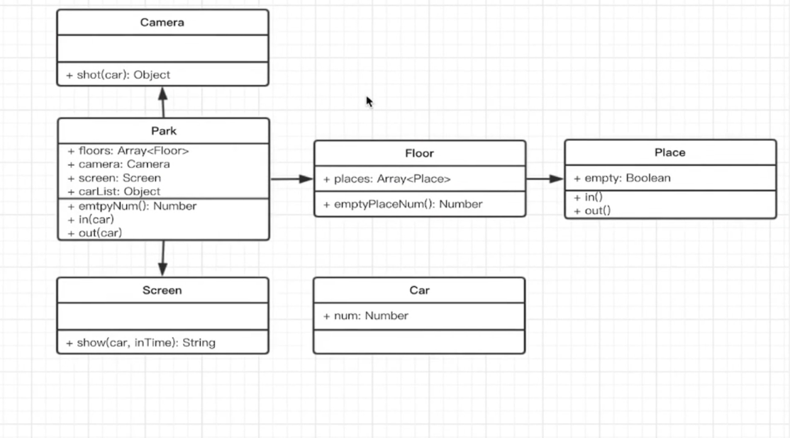 class Park { constructor(floors) { this.camera = new Camera this.screen = new Screen this.floors = floors || [] this.carList = {} } in (car) { // 通过摄像头获取信息 const info = this.camera.shot(car) // 停到某个停车位 const i = parseInt(Math.random()*100) const place = this.floors[0].places[i] place.in() info.place = place this.carList[car.number] = info } out (car) { //获取信息 const info = this.carList[car.number] // 将停车位清空 const place = info.place place.out() // 显示时间 this.screen.show(car, info.inTime) delete this.carList[car.number] } // 停车场总共还有多少个空的车位 emptyPlaceNum (floors) { return this.floors.map((floor) => { return `第${floor.index}层还有${floor.emptyPlaceNum()}个空车位` }).join('\n') } } class Floor { constructor(index, places) { //index表示第几层 this.index = index this.places = places || [] } emptyPlaceNum() { let count = 0 for (let i=0;i<this.places.length;i++){ if (this.places[i].empty) { count+=1 } } // console.log(count) return count // let num = 0 // this.places.forEach(p => { // if (p.empty) { // num = num + 1 // } // }) // return num } } class Place { constructor() { this.empty = true } in () { // console.error('进来了') this.empty = false } out() { this.empty = true } } class Camera { shot(car) { return { num: car.number, inTime: Date.now() } // console.log(`车牌号:${car.number}`) // console.log(`进入时间:${new Date().getTime()}`) } } class Screen { show(car, inTime) { console.log(`车牌号:${car.number}`) console.log(`该车辆停留的时间为:${Date.now() - inTime}`) } } class Car { constructor(number) { this.number = number } } // 测试 // 初始化停车场 const floors = [] for (let i=0;i<3;i++){ const places = [] for (let j=0;j<100;j++) { places[j] = new Place() } floors[i] = new Floor(i+1, places) } const park = new Park(floors) const car1 = new Car(100) const car2 = new Car(110) const car3 = new Car(200) console.log('第一辆车进入') console.log(park.emptyPlaceNum()) park.in(car1) console.log('----------------') console.log('第二辆车进入') console.log(park.emptyPlaceNum()) park.in(car2) console.log('----------------') console.log('第一辆车离开') park.out(car1) console.log('----------------') console.log('第二辆车离开') park.out(car2) console.log('----------------') console.log('第三辆车进入') park.in(car3) console.log('----------------') console.log('第三辆车离开') console.log(park.emptyPlaceNum()) park.out(car3) 文章来源: https://blog.csdn.net/yexudengzhidao/article/details/89874089