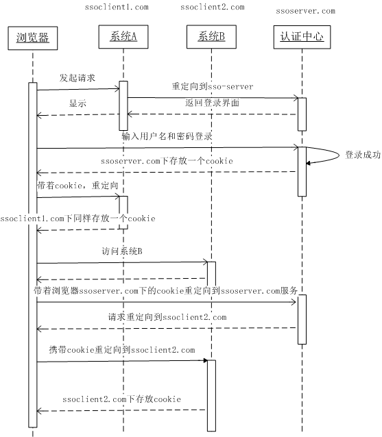 注:sso的核心在于系统A和系统B共享ssoserver.com下的cookie,如果系统A在浏览器X访问,系统B在浏览器Y访问,显示就不能共享cookie,还是要重新登录。