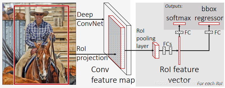 - 直接对输入图片深层卷积提取特征, 在特征上进行选择性搜索获取ROI, 这样只用提取一次特征, 原来需要2000次.即一次提取特征+多任务学习.