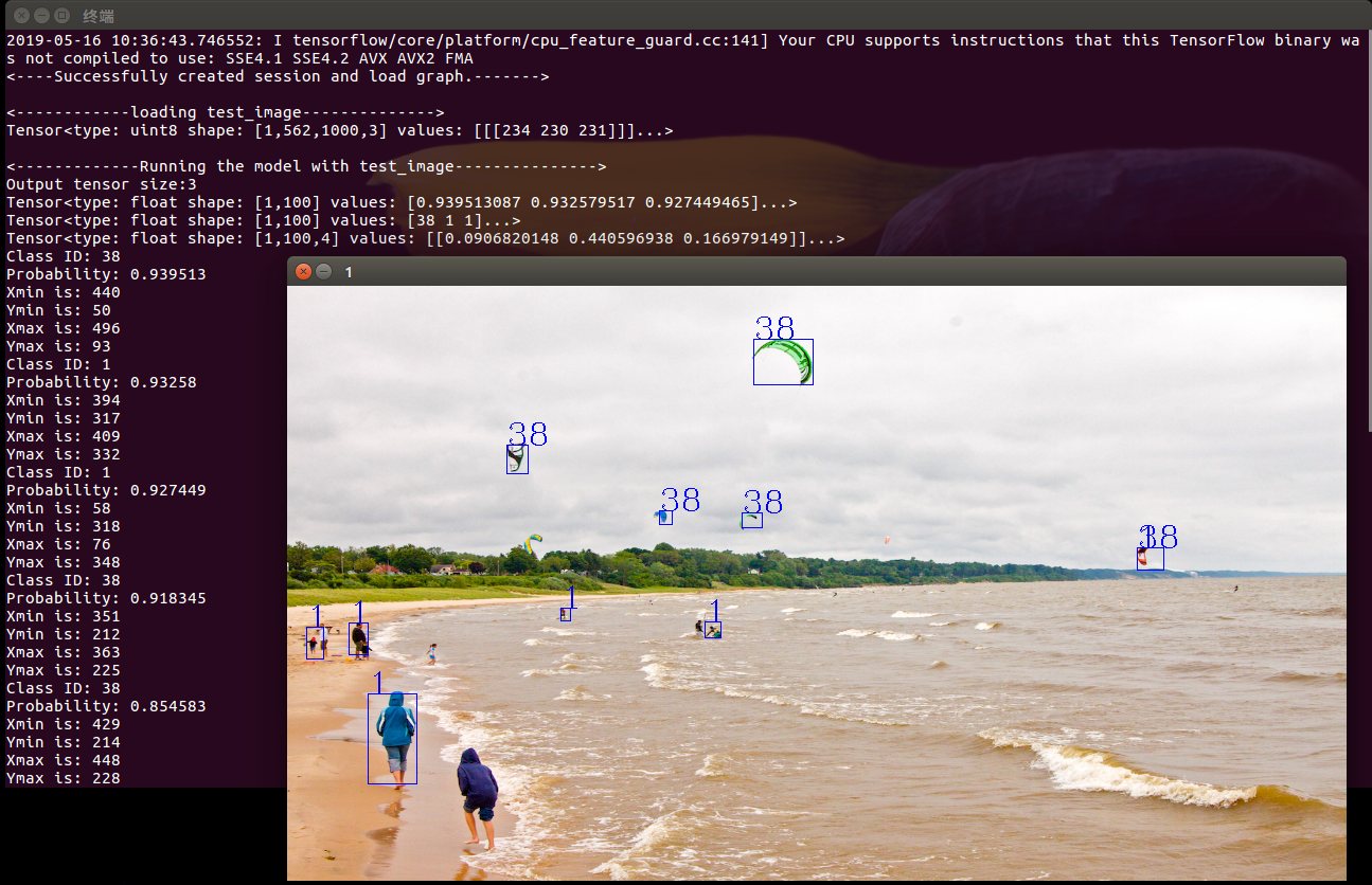 #include <iostream>  #include "tensorflow/cc/ops/const_op.h" #include "tensorflow/cc/ops/image_ops.h" #include "tensorflow/cc/ops/standard_ops.h" #include "tensorflow/core/framework/graph.pb.h" #include "tensorflow/core/framework/tensor.h" #include "tensorflow/core/graph/default_device.h" #include "tensorflow/core/graph/graph_def_builder.h" #include "tensorflow/core/lib/core/errors.h" #include "tensorflow/core/lib/core/stringpiece.h" #include "tensorflow/core/lib/core/threadpool.h" #include "tensorflow/core/lib/io/path.h" #include "tensorflow/core/lib/strings/stringprintf.h" #include "tensorflow/core/platform/env.h" #include "tensorflow/core/platform/init_main.h" #include "tensorflow/core/platform/logging.h" #include "tensorflow/core/platform/types.h" #include "tensorflow/core/public/session.h" #include "tensorflow/core/util/command_line_flags.h"  #include <opencv2/opencv.hpp> #include <cv.h> #include <highgui.h> #include <Eigen/Core> #include <Eigen/Dense>  using namespace std; using namespace cv; using namespace tensorflow;    // 定义一个函数讲OpenCV的Mat数据转化为tensor,python里面只要对cv2.read读进来的矩阵进行np.reshape之后, // 数据类型就成了一个tensor,即tensor与矩阵一样,然后就可以输入到网络的入口了,但是C++版本,我们网络开放的入口 // 也需要将输入图片转化成一个tensor,所以如果用OpenCV读取图片的话,就是一个Mat,然后就要考虑怎么将Mat转化为 // Tensor了 void CVMat_to_Tensor(Mat img,Tensor* output_tensor,int input_rows,int input_cols) {     //imshow("input image",img);     //图像进行resize处理     resize(img,img,cv::Size(input_cols,input_rows));     //imshow("resized image",img);      //归一化     img.convertTo(img,CV_8UC3);  // CV_32FC3     //img=1-img/255;      //创建一个指向tensor的内容的指针     uint8 *p = output_tensor->flat<uint8>().data();      //创建一个Mat,与tensor的指针绑定,改变这个Mat的值,就相当于改变tensor的值     cv::Mat tempMat(input_rows, input_cols, CV_8UC3, p);     img.convertTo(tempMat,CV_8UC3);   //    waitKey(0);  }  int main() {     /*--------------------------------配置关键信息------------------------------*/     string model_path="/home/xx/retrain_tf/ssd_inception_v2_coco/frozen_inference_graph.pb";     string image_path="/home/xx/image2.jpg";     int input_height = 562;     int input_width = 1000;     string input_tensor_name="image_tensor";     vector<string> out_put_nodes;  //注意,在object detection中输出的三个节点名称为以下三个     out_put_nodes.push_back("detection_scores");  //detection_scores  detection_classes  detection_boxes     out_put_nodes.push_back("detection_classes");     out_put_nodes.push_back("detection_boxes");      /*--------------------------------创建session------------------------------*/     Session* session;     Status status = NewSession(SessionOptions(), &session);//创建新会话Session      /*--------------------------------从pb文件中读取模型--------------------------------*/     GraphDef graphdef; //Graph Definition for current model      Status status_load = ReadBinaryProto(Env::Default(), model_path, &graphdef); //从pb文件中读取图模型;     if (!status_load.ok()) {         cout << "ERROR: Loading model failed..." << model_path << std::endl;         cout << status_load.ToString() << "\n";         return -1;     }     Status status_create = session->Create(graphdef); //将模型导入会话Session中;     if (!status_create.ok()) {         cout << "ERROR: Creating graph in session failed..." << status_create.ToString() << std::endl;         return -1;     }     cout << "<----Successfully created session and load graph.------->"<< endl;      /*---------------------------------载入测试图片-------------------------------------*/     cout<<endl<<"<------------loading test_image-------------->"<<endl;     Mat img;     img = imread(image_path);     cvtColor(img, img, CV_BGR2RGB);     if(img.empty())     {         cout<<"can't open the image!!!!!!!"<<endl;         return -1;     }      //创建一个tensor作为输入网络的接口     Tensor resized_tensor(DT_UINT8, TensorShape({1,input_height,input_width,3})); //DT_FLOAT      //将Opencv的Mat格式的图片存入tensor     CVMat_to_Tensor(img,&resized_tensor,input_height,input_width);      cout << resized_tensor.DebugString()<<endl;      /*-----------------------------------用网络进行测试-----------------------------------------*/     cout<<endl<<"<-------------Running the model with test_image--------------->"<<endl;     //前向运行,输出结果一定是一个tensor的vector     vector<tensorflow::Tensor> outputs;      Status status_run = session->Run({{input_tensor_name, resized_tensor}}, {out_put_nodes}, {}, &outputs);      if (!status_run.ok()) {         cout << "ERROR: RUN failed..."  << std::endl;         cout << status_run.ToString() << "\n";         return -1;     }      //把输出值给提取出     cout << "Output tensor size:" << outputs.size() << std::endl;  //3     for (int i = 0; i < outputs.size(); i++)     {         cout << outputs[i].DebugString()<<endl;   // [1, 50], [1, 50], [1, 50, 4]     }      cvtColor(img, img, CV_RGB2BGR);  // opencv读入的是BGR格式输入网络前转为RGB     resize(img,img,cv::Size(1000,562));  // 模型输入图像大小     int pre_num = outputs[0].dim_size(1);  // 50  模型预测的目标数量     auto tmap_pro = outputs[0].tensor<float, 2>();  //第一个是score输出shape为[1,50]     auto tmap_clas = outputs[1].tensor<float, 2>();  //第二个是class输出shape为[1,50]     auto tmap_coor = outputs[2].tensor<float, 3>();  //第三个是coordinate输出shape为[1,50,4]     float probability = 0.5;  //自己设定的score阈值     for (int pre_i = 0; pre_i < pre_num; pre_i++)     {         if (tmap_pro(0, pre_i) < probability)         {             break;         }         cout << "Class ID: " << tmap_clas(0, pre_i) << endl;  