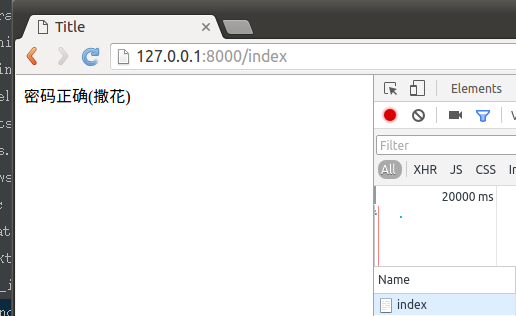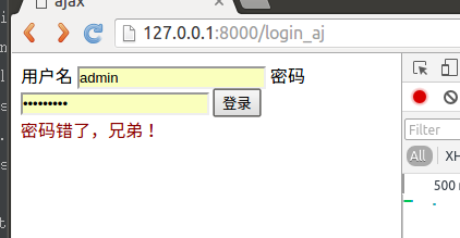 <!DOCTYPE html> <html lang="en"> <head> <meta charset="UTF-8"> <title>ajax</title> <script src="/static/js/jquery-1.12.4.min.js"></script> <script> $(function(){ $('#btnLogin').click(function () { #获取用户名密码 username = $('#username').val() password = $('#password').val() #ajax请求 $.ajax({ 'url':'/login_ajc', 'type':'post', 'data':{'username':username,'password':password}, 'dataType':'json', }).success(function(data){ #成功 res ==1 ;失败 res==0 if (data.res == 0){ $('#err').show().html('密码错了,兄弟!') } else { location.href = '/index' #成功时 跳转到index页面 } }) }) }) </script> <style> #err{ display: none; color:darkred; } </style> <body> <div> 用户名 <input type="text" id="username"> 密码 <input type="password" id="password"> <input type="button" id="btnLogin" value="登录"> </div> <div id="err">失败</div> </body> </html> 登录失败时,显示错误信息