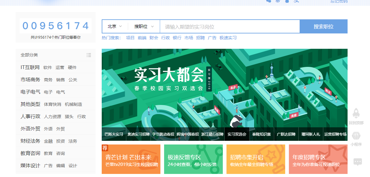 首先我们打开首页分析,我需要的是整站的数据,所以就需要将所有的分类都爬下来,如果你只是想分析某一个行业的数据,实习僧的接口也非常简单。