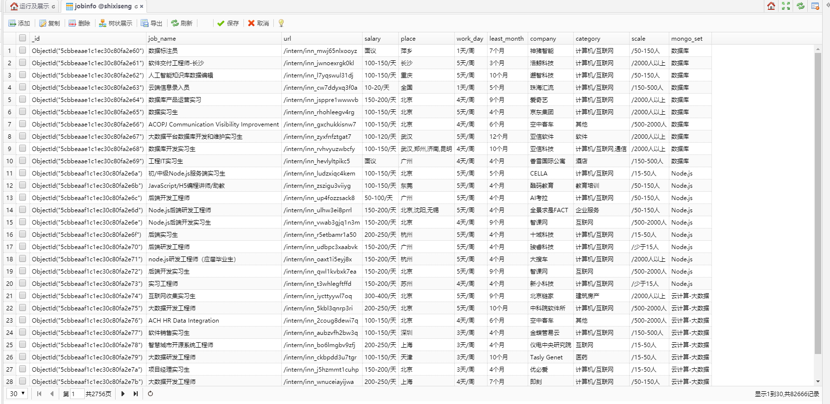 运行了一个多小时,爬虫正常停止,一共获取到了8万多条数据。所以实习僧首页显示的95万数据呢。难道是我没有爬全,我对比了一下类别和数量发现是全的。看了一下岗位连2017的都显示了,说明不是只显示最近的。那么只有两种情况了:实习僧首页的分类并没有显示全或者分类下的职位并没有全部显示,也有可能是首页的那个数据仅供参考,并没有实际意义。