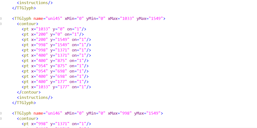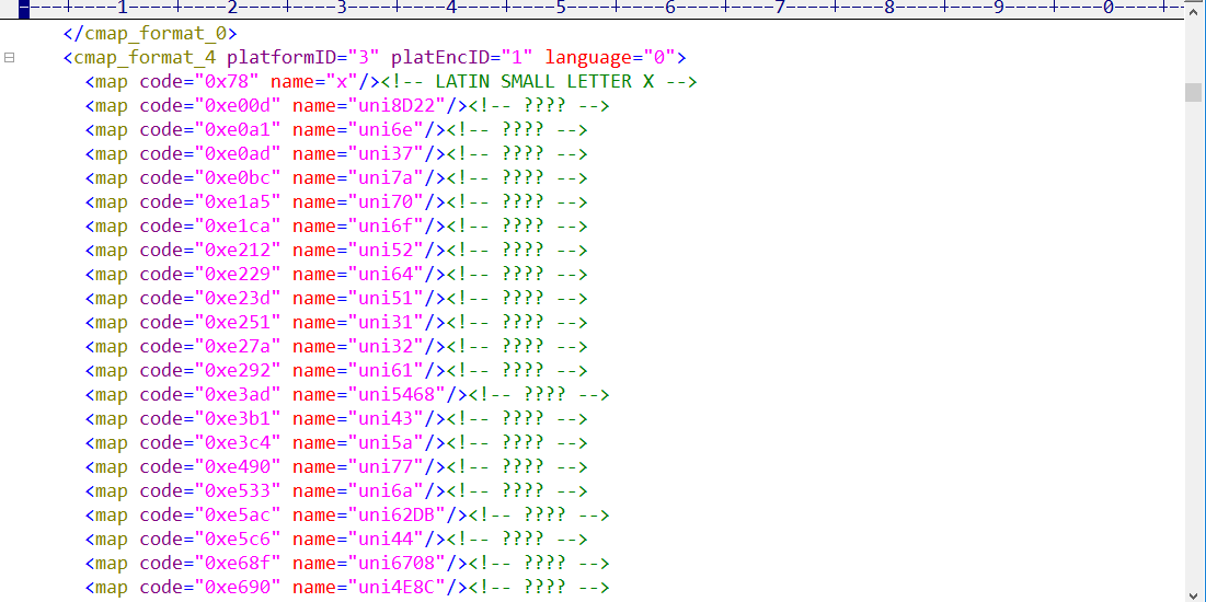 from fontTools.ttLib import TTFont font = TTFont('a.ttf') font.saveXML('a.xml') 使用文本编辑器打开xml文件,这里我使用的是editplus。