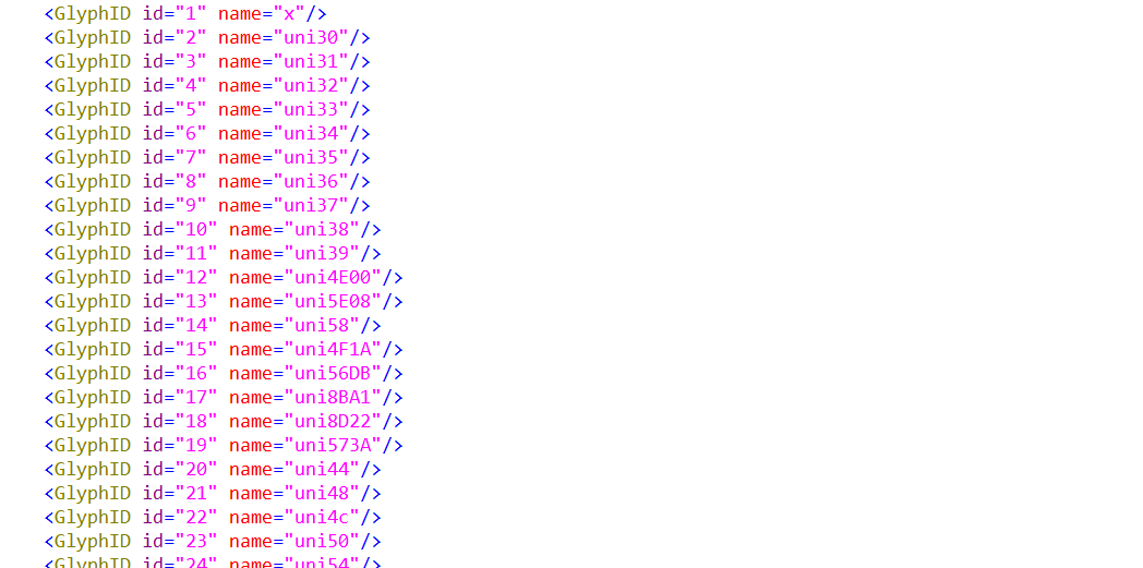 到了这里,我想很多人肯定是去百度找别人怎么解决这种问题的。当然,我也是,我看了很多关于字体反爬的文章,基本上是使用fonttools来寻找渲染字体代码是否相同,只要渲染代码相同,则判定为同一个字。为了方便人理解,我们先使用fonttools库将ttf文件转化为xml文件。