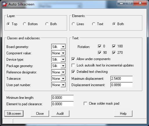 Autosilk top:最后出gerber的时候,自动生成的丝印层。会自动调整丝印位置,以及碰到阻焊开窗的地方,丝印会自动消失,避免露锡的地方涂上丝印(一般画丝印层的时候,焊盘上不会画上丝印,所以过孔焊盘上有丝印,也不会有什么影响。),所以我个人一般很少用到Autosilk top层,毕竟最后出丝印的时候,都需要调整位置。我一般直接用Silkscreen top。