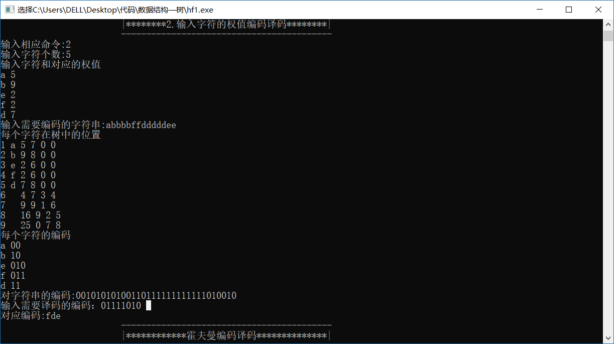 #include<iostream> #include<stdlib.h> #include<cstring> using namespace std; typedef struct hftree{ int might; int parent,lch,rch; char data; }*tree,node; typedef char** treecode; int length;//字符串长度; void chushi(tree &hf,int n)//初始话 { hf=new node[2*n]; for(int i=1;i<=2*n-1;i++) { hf[i].data='\0'; hf[i].might=0; hf[i].lch=0; hf[i].rch=0; hf[i].parent=0; } } void select(tree T,int n,int &s1,int &s2)//找出权值最小的两个; { int k,m; k=m=1000000; for(int j=1;j<=n;j++) { if(m>T[j].might&&T[j].parent==0) { m=T[j].might; s1=j; } } for(int i=1;i<=n;i++) { if(i!=s1&&k>T[i].might&&T[i].parent==0) { k=T[i].might; s2=i; } } } void hftree(tree &hf,int n)//创建霍夫曼树 { int s1,s2; if(n<=1) return; int m=2*n-1; for(int i=n+1;i<=m;++i) { select(hf,i-1,s1,s2); hf[s1].parent=i; hf[s2].parent=i; if(s1<=s2){ hf[i].lch=s1; hf[i].rch=s2; } else{ hf[i].lch=s2; hf[i].rch=s1; } hf[i].might=hf[s1].might+hf[s2].might; } } void codetree(tree hf,treecode &hc,int n)//获取字符的编码值 { int m,p; hc=new char*[n+1]; //指针数组; char *cd=new char[n]; //存放编码 cd[n-1]='\0'; for(int i=1;i<=n;i++) { int start=n-1; m=i; p=hf[i].parent; while(p!=0) { --start; if(hf[p].lch==m) { cd[start]='0'; } else cd[start]='1'; m=p; p=hf[p].parent; } hc[i]=new char[n-start]; strcpy(hc[i],&cd[start]); } delete []cd; } void input(tree &hf,int &n,char *date)//输入字符串 { char *a=date; int length_1; int num[256]={0}; int b[256]; int c[256]; cout<<"输入字符串:"; getchar(); gets(a); length_1=strlen(a); for(int i=0;i<length_1;i++) { num[(int)a[i]]++;//统计每个字符的权值 } n=0; for(int i=0;i<256;i++) { if(num[i]!=0) { b[n]=num[i]; c[n]=(char)i; ++n; } } hf=new node[2*n]; for(int i=1;i<=2*n-1;i++) { hf[i].data='\0'; hf[i].might=0; hf[i].lch=0; hf[i].rch=0; hf[i].parent=0; } for(int i=1;i<=n;i++) { hf[i].might=b[i-1]; hf[i].data=c[i-1]; } } int weizhi(tree hf,char *q,int n) //获取字符在树中的位置 { char *date=q; for(int j=1;j<=n;++j) { if(*date==hf[j].data) return j; } } void bianmachar(tree hf,char *q,treecode &result,int n)//对字符串编码 { char *date=q; char *cd; int m,p; result=new char * [length+1];//存放每个字符的编码值; cd=new char[n]; cd[n-1]='\0'; for(int i=0;i<length;++i) { m=weizhi(hf,&date[i],n);//获取每个字符在树中的位置 int start=n-1; p=hf[m].parent; while(p!=0) { --start; if(hf[p].lch==m) { cd[start]='0'; } else cd[start]='1'; m=p; p=hf[p].parent; } result[i+1]=new char[n-start]; strcpy(result[i+1],&cd[start]); } delete cd; } void chu(tree hf,treecode hc,treecode result,int n)//输出编码 { int m=2*n-1; cout<<"每个字符在树中的位置"<<endl; for(int i=1;i<=m;i++) { cout<<i<<" "<<hf[i].data<<" "<<hf[i].might<<" "<<hf[i].parent<<" "<<hf[i].lch<<" "<<hf[i].rch<<endl; } cout<<"每个字符的编码"<<endl; for(int i=1;i<=n;i++) { cout<<hf[i].data<<" "<<hc[i]<<endl; } cout<<"对字符串的编码:"; for(int j=1;j<=length;j++) { cout<<result[j]; } } void input_(tree &hf,int &n) //输入每个字符和对应的权值 { cout<<"输入字符和对应的权值"<<endl; for(int i=1;i<=n;i++) { cin>>hf[i].data; cin>>hf[i].might; } } void Decodehf(tree hf,char *m,int n)//译码 { char*date=m;//编码字符串 int LL=strlen(date);//编码字符串长度 char data[100];//解码字符串; int p=2*n-1;//获取根节点的位置; int j=0;//头指针 for(int i=0;i<length;i++) { if(date[i]=='0') p=hf[p].lch; else if(date[i]=='1') p=hf[p].rch; if(hf[p].lch==0&&hf[p].rch==0) { data[j]=hf[p].data; p=2*n-1; ++j; } } cout<<"对应编码:"; for(int k=0;k<j;k++) { cout<<data[k]; } cout<<endl; } void Xmb()//界面 { cout<<"\t\t\t------------------------------------------"<<endl; cout<<"\t\t\t|************霍夫曼编码译码**************|"<<endl; cout<<"\t\t\t|----------------------------------------|"<<endl; cout<<"\t\t\t|********1.对字符串进行编码译码**********|"<<endl; cout<<"\t\t\t|----------------------------------------|"<<endl; cout<<"\t\t\t|********2.输入字符的权值编码译码********|"<<endl; cout<<"\t\t\t------------------------------------------"<<endl; } int main() { char a; char date_1[100];//输入字符串统计权值 char date_2[100];//需要要编码的字符串 char date_3[100];//存储译码的字符串 tree hf; //hfm树 treecode hc;//存储每个字符的译码 treecode result;//存放译码的字符串 int n;//拥有权值的字符个数 while(1) { Xmb(); cout<<"输入相应命令:"; cin>>a; switch(a) { case '1': input(hf,n,date_1); hftree(hf,n);//创建霍夫曼树 codetree(hf,hc,n);//每个字符的编码 cout<<"输入需要编码的字符串:"; gets(date_2); length=strlen(date_2); bianmachar(hf,date_2,result,n);//字符串的编码 chu(hf,hc,result,n); cout<<endl; cout<<"输入需要译码的编码:" ; gets(date_3); Decodehf(hf,date_3,n); break; case '2': cout<<"输入字符个数:"; cin>>n; chushi(hf,n);//对霍夫曼树初始化 input_(hf,n);//输入字符和对应的权值 hftree(hf,n); codetree(hf,hc,n); cout<<"输入需要编码的字符串:"; getchar(); gets(date_2); length=strlen(date_2); bianmachar(hf,date_2,result,n); chu(hf,hc,result,n); cout<<endl; cout<<"输入需要译码的编码:" ; gets(date_3); Decodehf(hf,date_3,n); break; case '0': exit(0); } } }