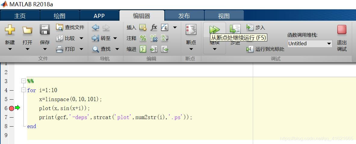点击左侧小横线,应该开始是灰色,然后点击运行,就会变成红色加一个绿色的箭头,此时鼠标放到某些变量上会有数值变化。此时的命令行窗口会变为k>>,退出debug后,变回f(x)>>,同时在工作区也能看变量的信息。