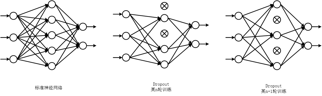 按一定概率(如0.5的概率)将隐藏层的某些节点从网络中剔除,本轮训练不进行更新,待其他轮进行更新.每轮训练都会已一定概率更新权重,而不是更新全部权重,如图3.2所示,标准神经网络每轮训练更新全部权重参数,使用Dropout每轮训练,更新部分参数,另一部分参数不更新,待下次下一轮或下面某一轮更新,这种方法可有效降低过拟合程度.