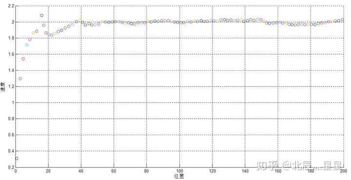 %卡尔曼滤波(小车[速度,位置]例子)观测数据多 clc,clear,close all %% 传感器观测 %-------------------------------------------------------------------------- %Z = H * X + v %X为t-1时刻实际状态 %Z为t-1时刻实际观测数据 %H为测量系统的参数,即观察矩阵 %v为观测噪声,其协方差矩阵为R %-------------------------------------------------------------------------- Z=(1:2:200); %理想观测值 (汽车的位置,也就是我们要修改的量),设定变化是1:2:200,则速度就是2 noise=randn(1,100); %在理想观测值上叠加方差为1的高斯噪声 Z=Z+noise;%模拟的实际观测值 H=[1,0];%传感器提供的观测矩阵 R=1;%传感器的观测噪声协方差矩阵 %% 初始状态(均值)和状态协方差 %基于高斯分布建立状态变量需要均值和协方差(即X和P) X=[0;0]; %初始状态 X=[位置;速度] P=[1 0;0 1]; %状态协方差矩阵 %% 状态转移矩阵(表示如何由上一状态推测当前状态),它同时作用与X和P来预测下一时刻的X和P F=[1 1;0 1]; %在速度例题中为[1 delta(t);0 1] %% 外部干扰用状态转移协方差矩阵Q表示 Q=[0.0001,0;0 , 0.0001]; %% 卡尔曼滤波 figure; hold on; for i = 1:length(Z) %迭代次数 %% 预测 X_ = F*X;%基于上一状态预测当前状态 X_为t时刻状态预测(这里没有控制) P_ = F*P*F'+Q;%更新协方差 Q系统过程的协方差 %% 计算卡尔曼增益 K = P_*H'/(H*P_*H'+R); %% 更新 X = X_+K*(Z(i)-H*X_);% 得到当前状态的最优化估算值 增益乘以残差 P = (eye(2)-K*H)*P_;%更新K状态的协方差 %% 绘图 set(0,'defaultfigurecolor','w') scatter(X(1),X(2)); xlabel('位置'),ylabel('速度') grid on %在代码中,我们设定x的变化是1:2:200,则速度就是2 %由上图看到,值经过几次迭代,速度就基本上在 2 附近摆动,摆动的原因是我们加入了噪声。 end