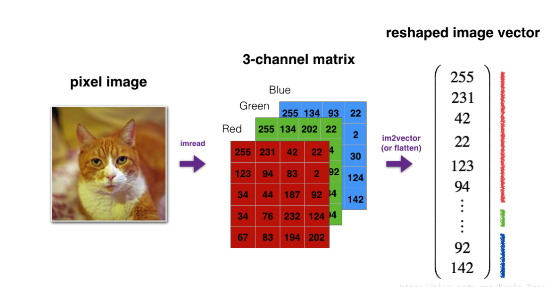 def image2vector(image): """ 把一个m*n*z 的图形矩阵变成 m*n*z 行 1列的矩阵 """ v = image.reshape((image.shape[0]*image.shape[1]*image.shape[2]),1) return v 测试一下: