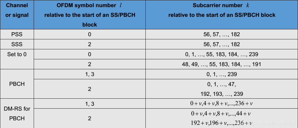 block占用240个连续的子载波,子载波在block内编号0~239。具体的时频资源映射见38.211-Table7.4.3.1-1: