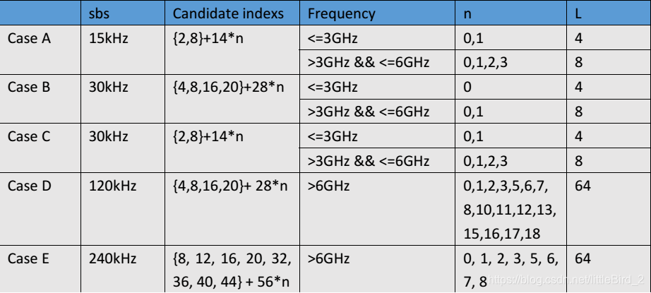 可以看到,对于不同的情况,候选SS/PBCH block时刻会有多个,即L=4、L=8、L=64。
