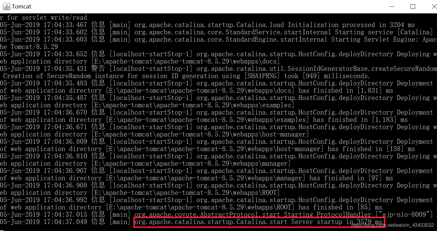 打开命令提示符,进入到Tomcat8.5.29的安装目录下,并进入到bin目录下,输入startup.bat命令,启动Tomcat。期间系统会西东打开一个Tomcat窗口,如下图所示(红色框表示Tomcat启动成功):