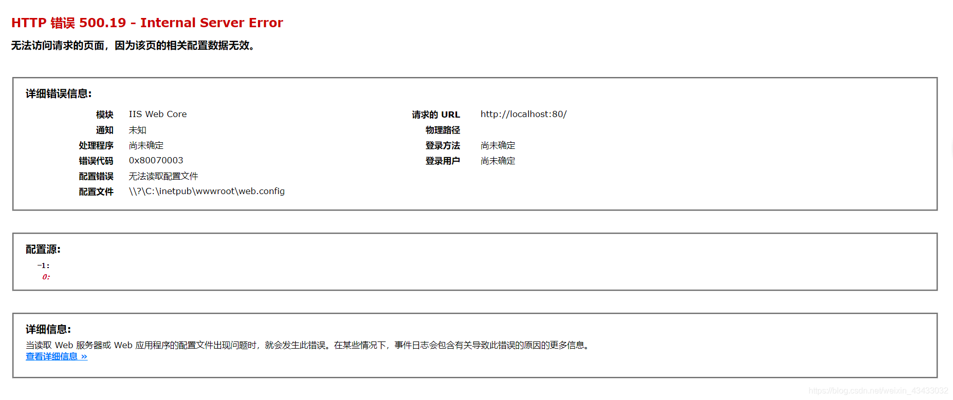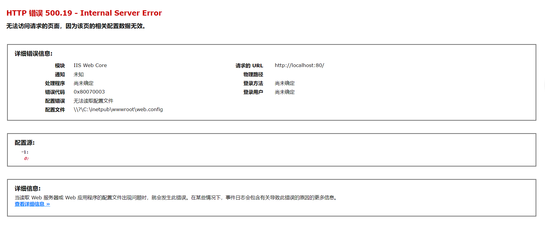 http://localhost:服务器端口号 或者 http://电脑IP地址:服务器端口号 输入http://localhost:80(80是更改配置的服务器端口号),回车等待页面刷新结果。但是却出现了500.19错误,是由于相关配置出错所导致的,如下图: