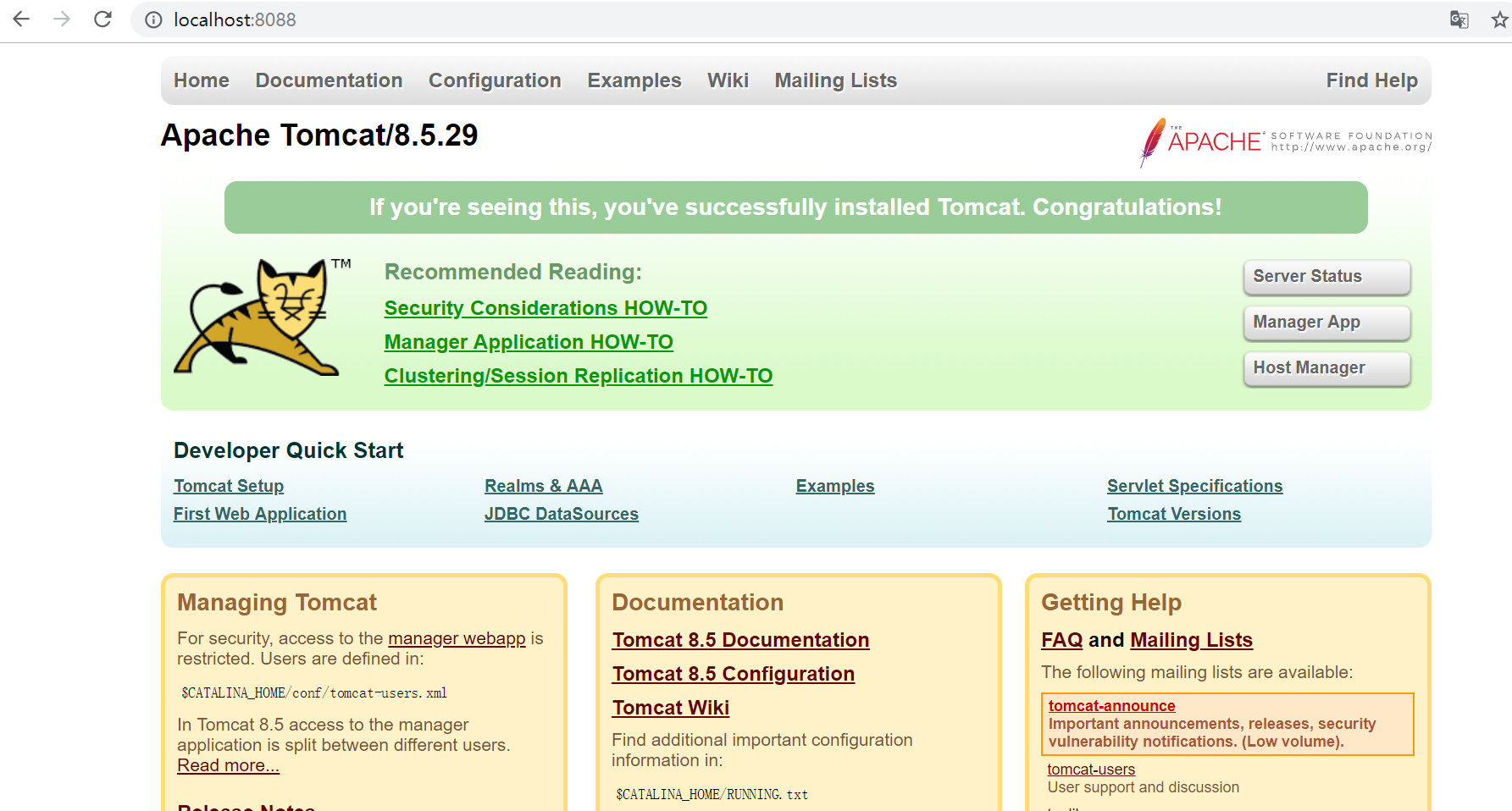 打开命令提示符,进入Tomcat安装目录下的bin路径,执行shutdown.bat命令先关闭Tomcat,然后执行startup.bat命令启动Tomcat,最后在浏览器中输入http://localhost:8088(8088是修改之后的服务器端口号),等待页面刷新,若出现以下页面则说明Tomcat成功启动。