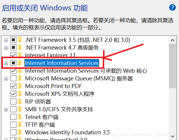 在新打开的窗口中,选择“Internet Information Services”左边的加号将其展开。