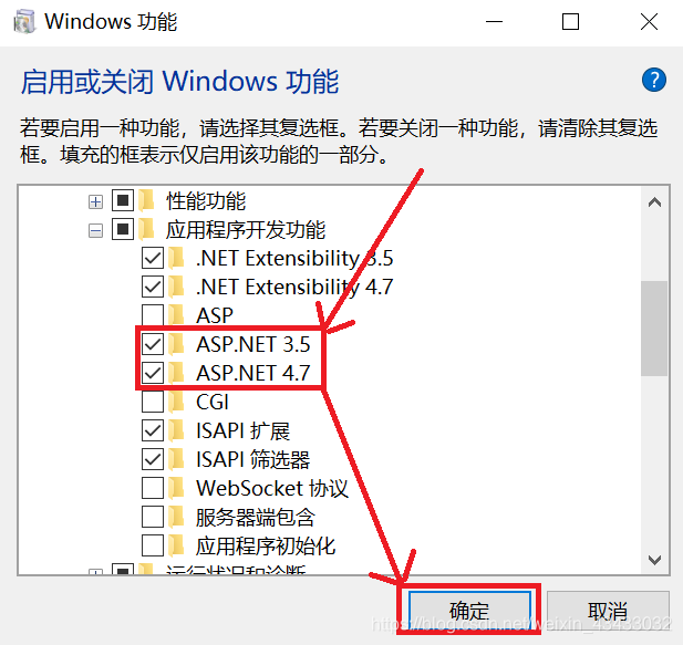 在展开的列表中选择ASP.NET 3.5和ASP.NET 4.7并勾选,在勾选这两项时其他选项也会自动勾选上,完成之后点击确定。