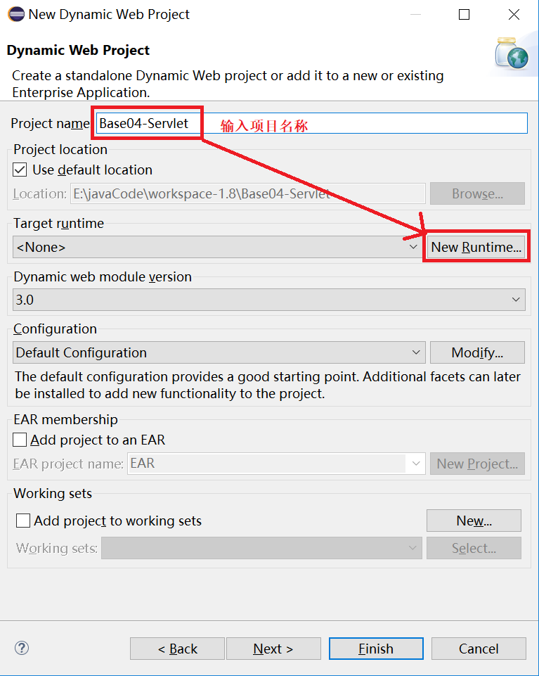 第一步:new一个Dynamic Web Project,在弹出页面中输入项目名称之后,点击New Runtime…。