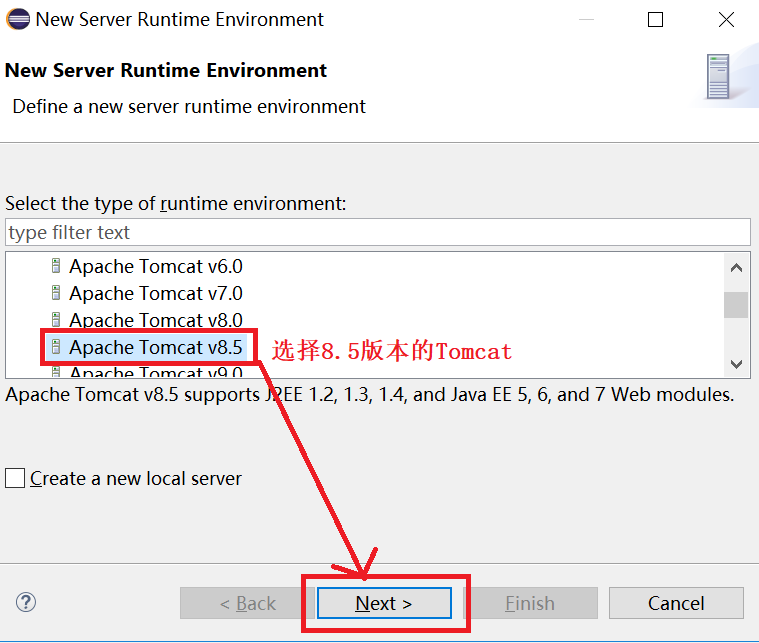 在弹出的页面中根据Tomcat版本选择合适的服务器版本,此处安装的是8.5.29版本,选择Apache Tomcat v8.5即可,然后点击Next。