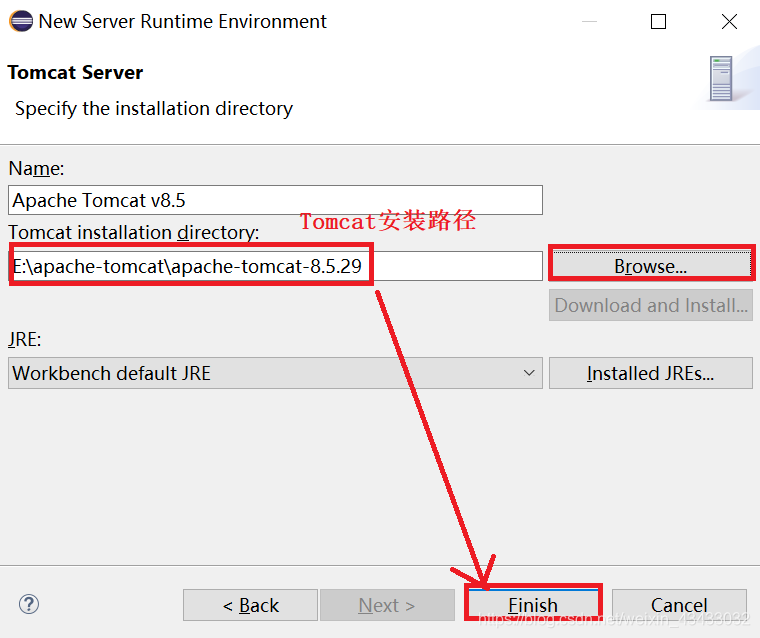 在弹出的页面中选择Browse…,选择Tomcat的安装路径,完成之后点击Finish。