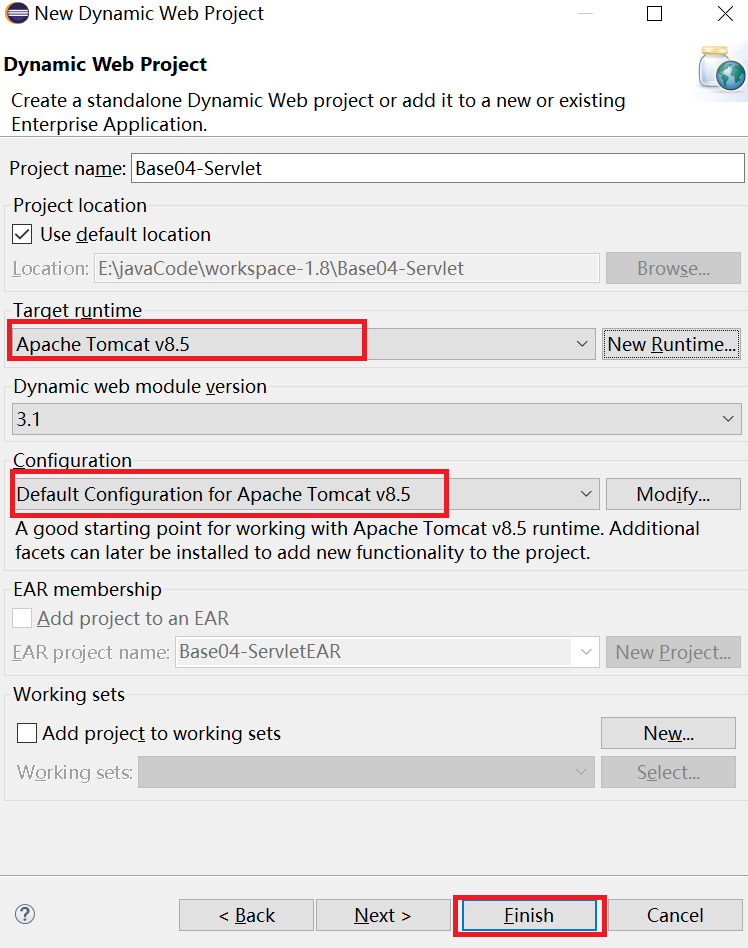 回到Dynamic Web Project页面,会发现有关于Tomcat的相关内容都自动匹配上了,直接点击Finish即可。