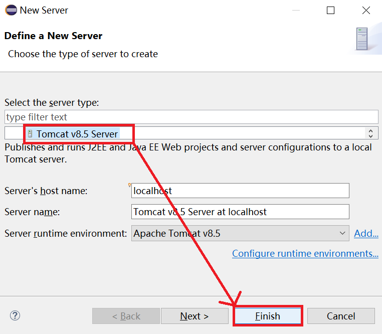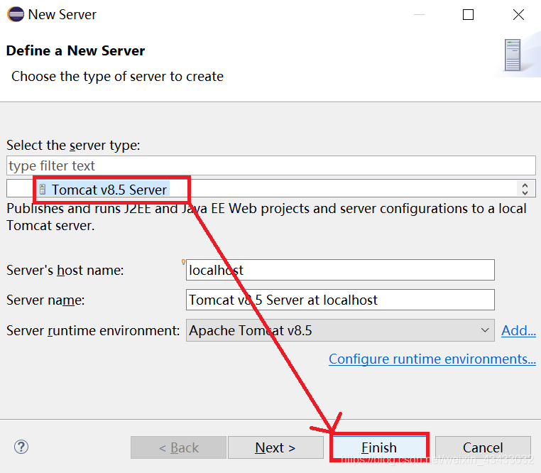在弹出的页面中选择"Tomcat v8.5 Server”,其他的都是自动识别匹配出来的,不用做更改,然后点击Finish即可。
