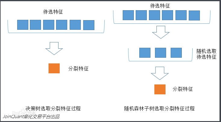 下图中,蓝色的方块代表所有可以被选择的特征,也就是目前的待选特征。黄色的方块是分裂特征。左边是一棵决策树的特征选取过程,通过在待选特征中选取最优的分裂特征(别忘了前文提到的ID3算法,C4.5算法,CART算法等等),完成分裂。右边是一个随机森林中的子树的特征选取过程。