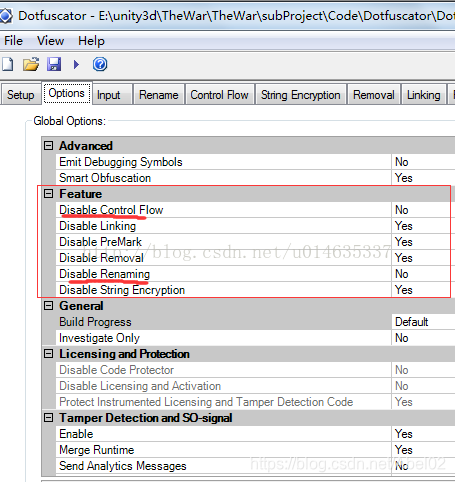 2我们在看下Options,这里是全局设置,我们只开启流程混淆和重命名,选No,其它禁用Yes,其它默认(最后一个string encryption是字符串混淆,跟据需求选择)