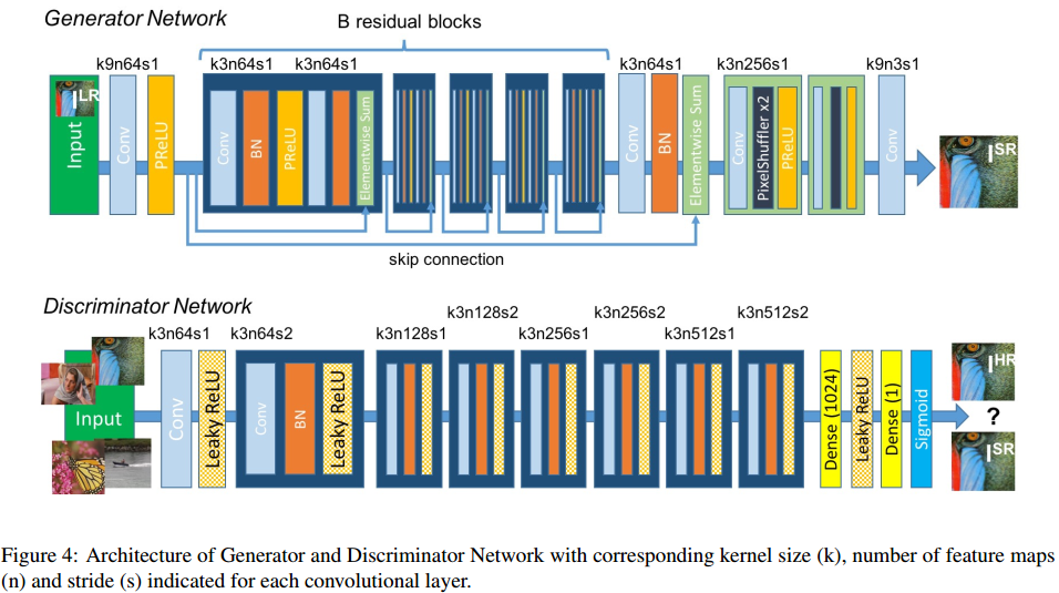 Generator network的作用是尽可能的产生一张高分辨率的图片,在生成网络部分(SRResNet)部分包含多个残差块,每个残差块中包含两个3×3的卷积层,卷积层后接批规范化层(batch normalization, BN)和PReLU作为激活函数,两个2×亚像素卷积层(sub-pixel convolution layers)被用来增大特征尺寸。