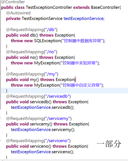 @Autowired private TestExceptionDao testExceptionDao; @Override public void servicemy() throws Exception { throw new MyException("Service中自定义异常"); } @Override public void servicedb() throws Exception { throw new SQLException("Service中数据库异常"); } @Override public void daomy() throws Exception { testExceptionDao.daomy(); } @Override public void daodb() throws Exception { testExceptionDao.daodb(); } @Override public void serviceno() throws Exception { throw new MyException("Service中未知异常"); } @Override public void daono() throws Exception { testExceptionDao.daono(); } 3.在控制器中映射各种dao层、service层、controller层的异常