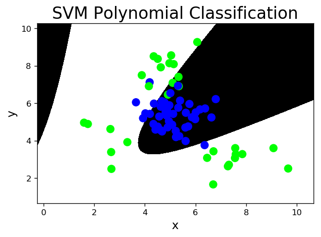 # svm_poly.py # 基于3次多项式核函数的支持向量机分类器 model = svm.SVC(kernel='poly', degree=3) model.fit(train_x, train_y) l, r, h = x[:, 0].min() - 1, x[:, 0].max() + 1, 0.005 b, t, v = x[:, 1].min() - 1, x[:, 1].max() + 1, 0.005 grid_x = np.meshgrid(np.arange(l, r, h), np.arange(b, t, v)) flat_x = np.c_[grid_x[0].ravel(), grid_x[1].ravel()] flat_y = model.predict(flat_x) grid_y = flat_y.reshape(grid_x[0].shape) pred_test_y = model.predict(test_x) cr = sm.classification_report(test_y, pred_test_y) print(cr) mp.figure('SVM Polynomial Classification', dpi=120) mp.title('SVM Polynomial Classification', fontsize=20) mp.xlabel('x', fontsize=14) mp.ylabel('y', fontsize=14) mp.tick_params(labelsize=10) mp.pcolormesh(grid_x[0], grid_x[1], grid_y, cmap='gray') mp.scatter(test_x[:, 0], test_x[:, 1], c=test_y, cmap='brg', s=80) mp.show() /Users/haoen110/miniconda3/lib/python3.7/site-packages/sklearn/svm/base.py:193: FutureWarning: The default value of gamma will change from 'auto' to 'scale' in version 0.22 to account better for unscaled features. Set gamma explicitly to 'auto' or 'scale' to avoid this warning. "avoid this warning.", FutureWarning) precision recall f1-score support 0 0.91 0.87 0.89 45 1 0.81 0.87 0.84 30 accuracy 0.87 75 macro avg 0.86 0.87 0.86 75 weighted avg 0.87 0.87 0.87 75