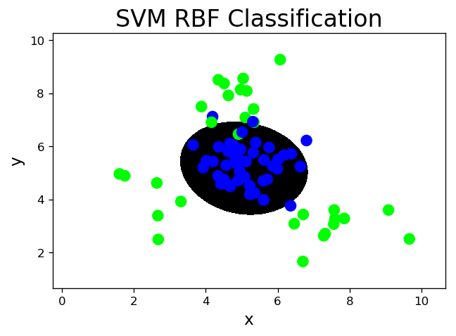 # svm_rbf.py # 基于径向基核函数的支持向量机分类器 model = svm.SVC(kernel='rbf', C=600, gamma=0.01) model.fit(train_x, train_y) l, r, h = x[:, 0].min() - 1, x[:, 0].max() + 1, 0.005 b, t, v = x[:, 1].min() - 1, x[:, 1].max() + 1, 0.005 grid_x = np.meshgrid(np.arange(l, r, h), np.arange(b, t, v)) flat_x = np.c_[grid_x[0].ravel(), grid_x[1].ravel()] flat_y = model.predict(flat_x) grid_y = flat_y.reshape(grid_x[0].shape) pred_test_y = model.predict(test_x) cr = sm.classification_report(test_y, pred_test_y) print(cr) mp.figure('SVM RBF Classification', dpi=120) mp.title('SVM RBF Classification', fontsize=20) mp.xlabel('x', fontsize=14) mp.ylabel('y', fontsize=14) mp.tick_params(labelsize=10) mp.pcolormesh(grid_x[0], grid_x[1], grid_y, cmap='gray') mp.scatter(test_x[:, 0], test_x[:, 1], c=test_y, cmap='brg', s=80) mp.show() precision recall f1-score support 0 0.98 0.91 0.94 45 1 0.88 0.97 0.92 30 accuracy 0.93 75 macro avg 0.93 0.94 0.93 75 weighted avg 0.94 0.93 0.93 75