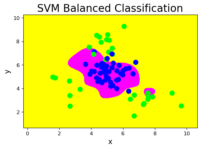 # svm_bal.py # 带有类别权重均衡的支持向量机分类器 model = svm.SVC(kernel='rbf', C=100, gamma=1, class_weight='balanced') model.fit(train_x, train_y) l, r, h = x[:, 0].min() - 1, x[:, 0].max() + 1, 0.005 b, t, v = x[:, 1].min() - 1, x[:, 1].max() + 1, 0.005 grid_x = np.meshgrid(np.arange(l, r, h), np.arange(b, t, v)) flat_x = np.c_[grid_x[0].ravel(), grid_x[1].ravel()] flat_y = model.predict(flat_x) grid_y = flat_y.reshape(grid_x[0].shape) pred_test_y = model.predict(test_x) cr = sm.classification_report(test_y, pred_test_y) print(cr) mp.figure('SVM Balanced Classification', dpi=120) mp.title('SVM Balanced Classification', fontsize=20) mp.xlabel('x', fontsize=14) mp.ylabel('y', fontsize=14) mp.tick_params(labelsize=10) mp.pcolormesh(grid_x[0], grid_x[1], grid_y, cmap='spring') mp.scatter(test_x[:, 0], test_x[:, 1], c=test_y, cmap='brg', s=80) mp.show() precision recall f1-score support 0 0.93 0.91 0.92 45 1 0.87 0.90 0.89 30 accuracy 0.91 75 macro avg 0.90 0.91 0.90 75 weighted avg 0.91 0.91 0.91 75