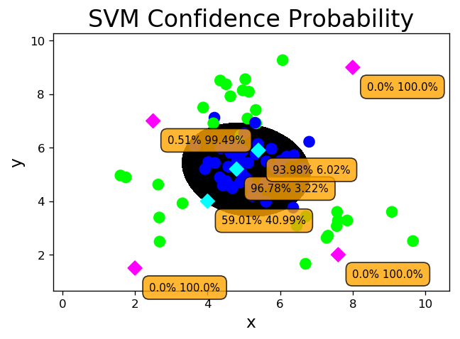 # svm_prob.py # 能够计算置信概率的支持向量机分类器 model = svm.SVC(kernel='rbf', C=600, gamma=0.01, probability=True) model.fit(train_x, train_y) l, r, h = x[:, 0].min() - 1, x[:, 0].max() + 1, 0.005 b, t, v = x[:, 1].min() - 1, x[:, 1].max() + 1, 0.005 grid_x = np.meshgrid(np.arange(l, r, h), np.arange(b, t, v)) flat_x = np.c_[grid_x[0].ravel(), grid_x[1].ravel()] flat_y = model.predict(flat_x) grid_y = flat_y.reshape(grid_x[0].shape) pred_test_y = model.predict(test_x) cr = sm.classification_report(test_y, pred_test_y) print(cr) prob_x = np.array([ [2, 1.5], [8, 9], [4.8, 5.2], [4, 4], [2.5, 7], [7.6, 2], [5.4, 5.9]]) print(prob_x) pred_prob_y = model.predict(prob_x) print(pred_prob_y) probs = model.predict_proba(prob_x) print(probs) mp.figure('SVM Confidence Probability', dpi=120) mp.title('SVM Confidence Probability', fontsize=20) mp.xlabel('x', fontsize=14) mp.ylabel('y', fontsize=14) mp.tick_params(labelsize=10) mp.pcolormesh(grid_x[0], grid_x[1], grid_y, cmap='gray') mp.scatter(test_x[:, 0], test_x[:, 1], c=test_y, cmap='brg', s=80) mp.scatter(prob_x[:, 0], prob_x[:, 1], c=pred_prob_y, cmap='cool', s=70, marker='D') for i in range(len(probs)): mp.annotate( '{}% {}%'.format( round(probs[i, 0] * 100, 2), round(probs[i, 1] * 100, 2)), xy=(prob_x[i, 0], prob_x[i, 1]), xytext=(12, -12), textcoords='offset points', horizontalalignment='left', verticalalignment='top', fontsize=9, bbox={'boxstyle': 'round,pad=0.6', 'fc': 'orange', 'alpha': 0.8}) mp.show() precision recall f1-score support 0 0.98 0.91 0.94 45 1 0.88 0.97 0.92 30 accuracy 0.93 75 macro avg 0.93 0.94 0.93 75 weighted avg 0.94 0.93 0.93 75 [[2. 1.5] [8. 9. ] [4.8 5.2] [4. 4. ] [2.5 7. ] [7.6 2. ] [5.4 5.9]] [1 1 0 0 1 1 0] [[3.00000090e-14 1.00000000e+00] [3.00000090e-14 1.00000000e+00] [9.67771568e-01 3.22284319e-02] [5.90127228e-01 4.09872772e-01] [5.13650760e-03 9.94863492e-01] [3.13832983e-10 1.00000000e+00] [9.39755320e-01 6.02446797e-02]]