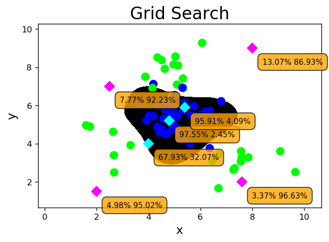 # svm_gs.py # 超参数组合列表 params = [ {'kernel': ['linear'], 'C': [1, 10, 100, 1000]}, {'kernel': ['poly'], 'C': [1], 'degree': [2, 3]}, {'kernel': ['rbf'], 'C': [1, 10, 100, 1000], 'gamma': [1, 0.1, 0.01, 0.001]}] # 网格搜索寻优 model = ms.GridSearchCV( svm.SVC(probability=True), params, cv=5) model.fit(train_x, train_y) for param, score in zip( model.cv_results_['params'], model.cv_results_['mean_test_score']): print(param, score) print(model.best_params_) print(model.best_score_) print(model.best_estimator_) l, r, h = x[:, 0].min() - 1, x[:, 0].max() + 1, 0.005 b, t, v = x[:, 1].min() - 1, x[:, 1].max() + 1, 0.005 grid_x = np.meshgrid(np.arange(l, r, h), np.arange(b, t, v)) flat_x = np.c_[grid_x[0].ravel(), grid_x[1].ravel()] flat_y = model.predict(flat_x) grid_y = flat_y.reshape(grid_x[0].shape) pred_test_y = model.predict(test_x) cr = sm.classification_report(test_y, pred_test_y) print(cr) prob_x = np.array([ [2, 1.5], [8, 9], [4.8, 5.2], [4, 4], [2.5, 7], [7.6, 2], [5.4, 5.9]]) print(prob_x) pred_prob_y = model.predict(prob_x) print(pred_prob_y) probs = model.predict_proba(prob_x) print(probs) mp.figure('Grid Search', dpi=120) mp.title('Grid Search', fontsize=20) mp.xlabel('x', fontsize=14) mp.ylabel('y', fontsize=14) mp.tick_params(labelsize=10) mp.pcolormesh(grid_x[0], grid_x[1], grid_y, cmap='gray') mp.scatter(test_x[:, 0], test_x[:, 1], c=test_y, cmap='brg', s=80) mp.scatter(prob_x[:, 0], prob_x[:, 1], c=pred_prob_y, cmap='cool', s=70, marker='D') for i in range(len(probs)): mp.annotate( '{}% {}%'.format( round(probs[i, 0] * 100, 2), round(probs[i, 1] * 100, 2)), xy=(prob_x[i, 0], prob_x[i, 1]), xytext=(12, -12), textcoords='offset points', horizontalalignment='left', verticalalignment='top', fontsize=9, bbox={'boxstyle': 'round,pad=0.6', 'fc': 'orange', 'alpha': 0.8}) mp.show() precision recall f1-score support 0 0.95 0.93 0.94 45 1 0.90 0.93 0.92 30 accuracy 0.93 75 macro avg 0.93 0.93 0.93 75 weighted avg 0.93 0.93 0.93 75 [[2. 1.5] [8. 9. ] [4.8 5.2] [4. 4. ] [2.5 7. ] [7.6 2. ] [5.4 5.9]] [1 1 0 0 1 1 0] [[0.04981059 0.95018941] [0.1307007 0.8692993 ] [0.97548396 0.02451604] [0.67932359 0.32067641] [0.07771033 0.92228967] [0.03368725 0.96631275] [0.95910747 0.04089253]]