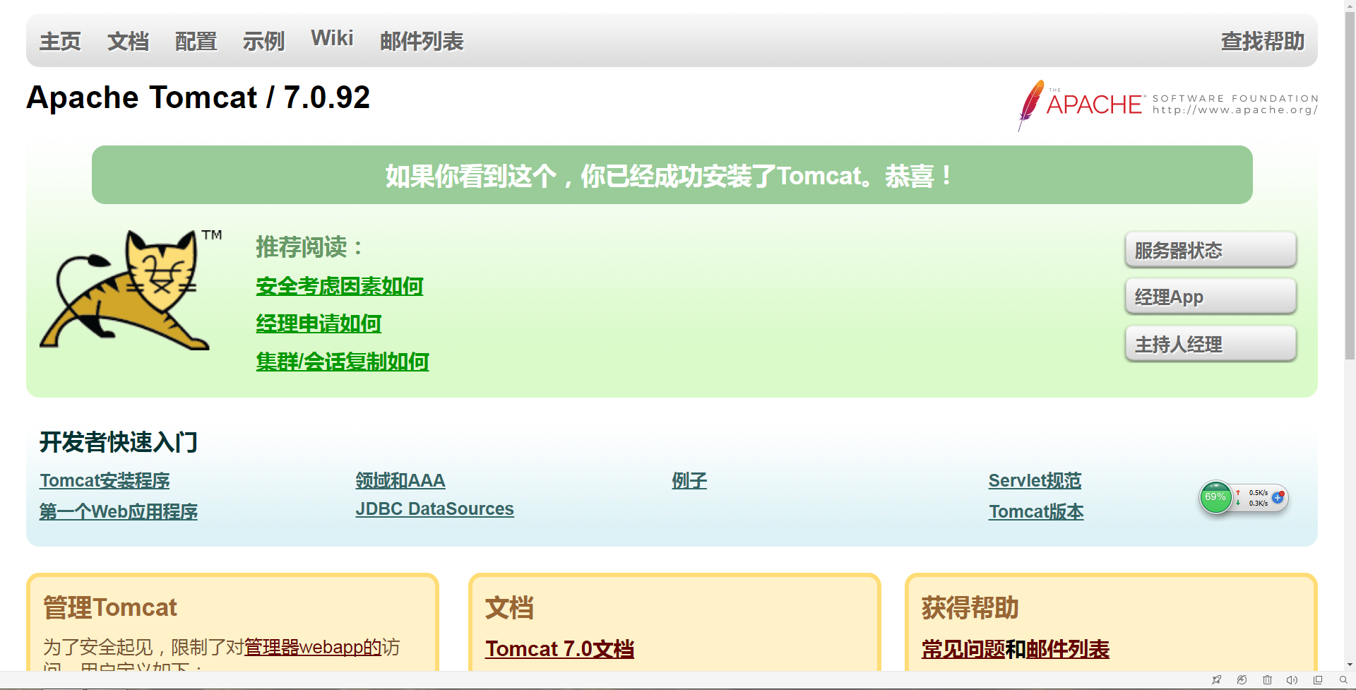 7、在浏览器输入 http://localhost:8080 若显示tomcat界面则本地服务器配置成功