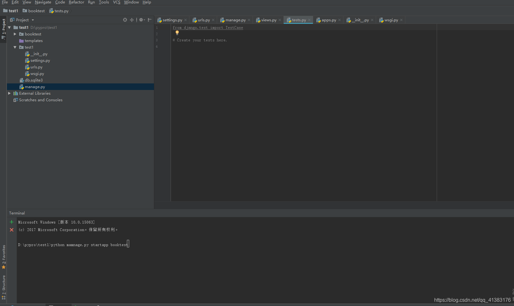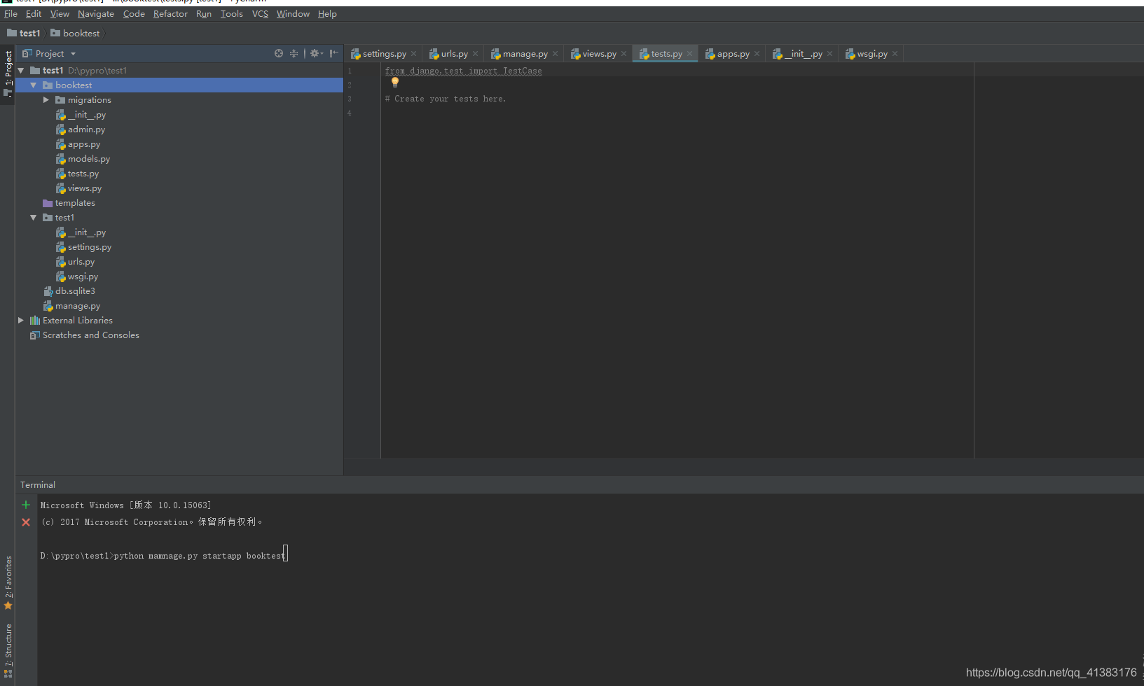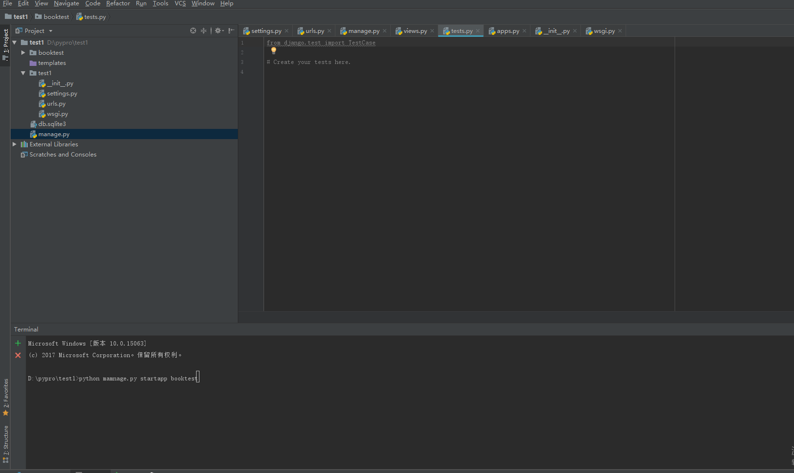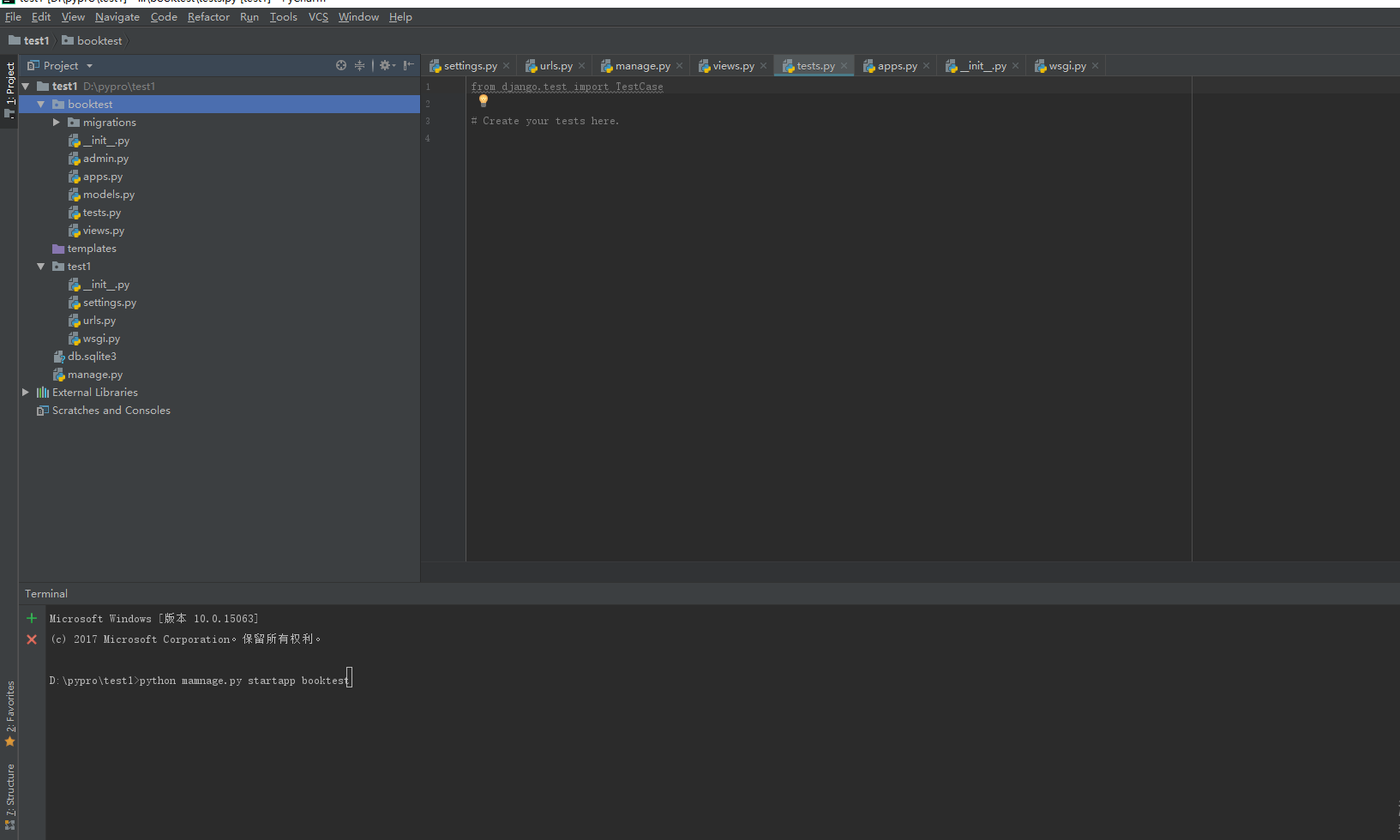 python mamnage.py startapp booktest 创建一个叫booktest的应用,应用可以创建多个