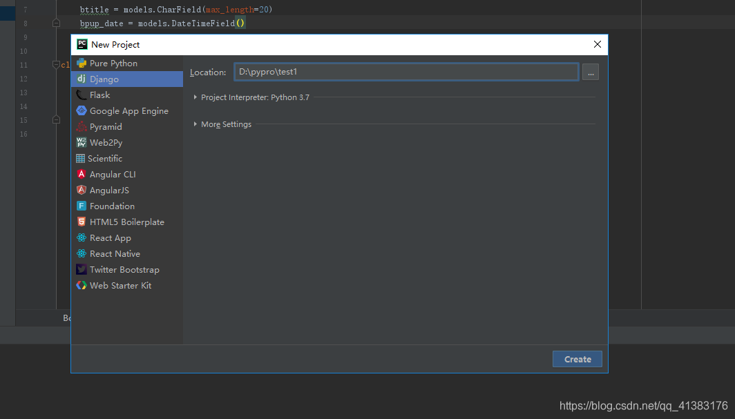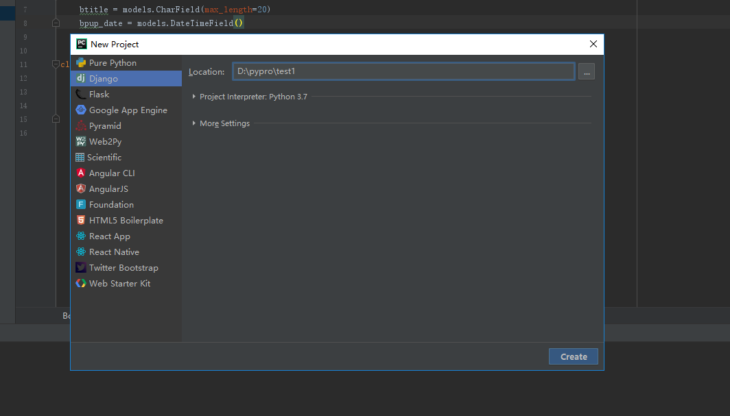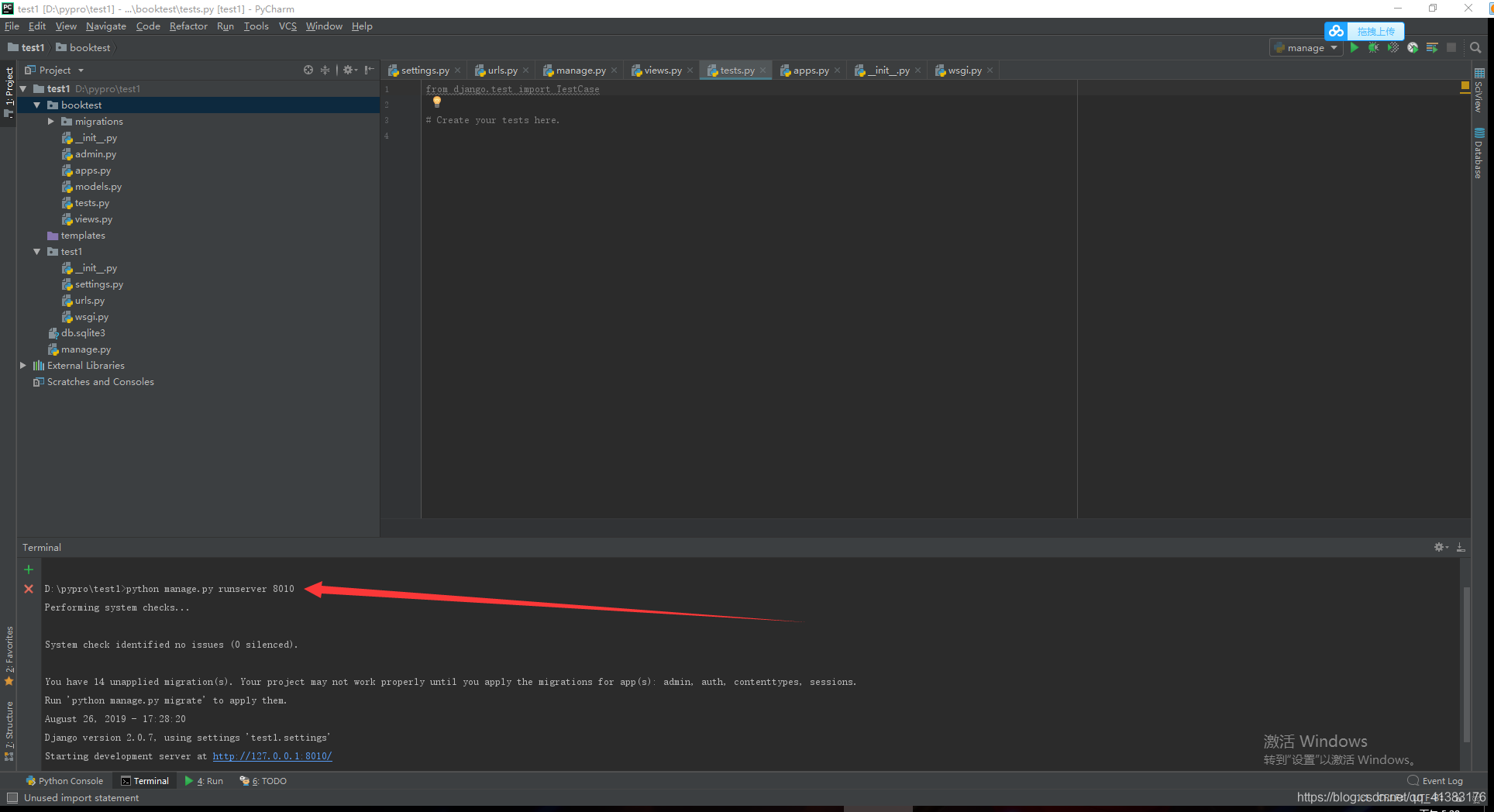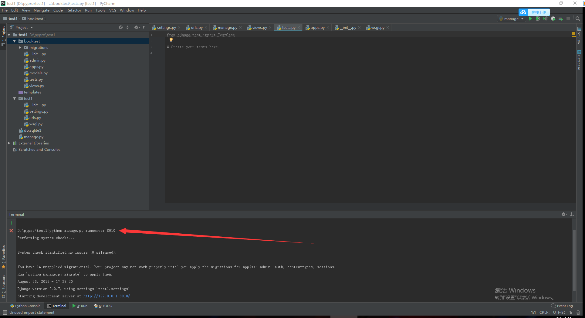 python mamnage.py startapp booktest 创建一个叫booktest的应用,应用可以创建多个