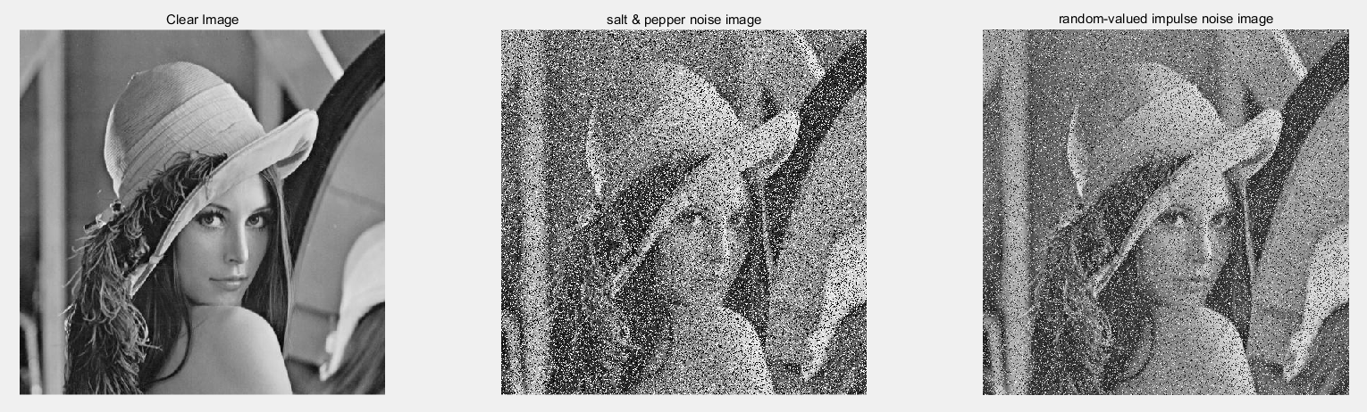 脉冲噪声产生的原因通常是由传感器单元中的死像素、硬件中的内存位置错误或者数字转换器错误等引起的。脉冲噪声分为两种类型,即椒盐噪声(salt & pepper noise (SPN))和随机值脉冲噪声(random-valued impulse noise (RVIN))。椒盐噪声是一种随机出现的白点或黑点,可能在亮的区域有黑色像素或者在暗区域有白色像素。在灰色图像中,常表现为最大灰度值或最小灰度值,即0或255。随机值脉冲噪声的噪声灰度值主要是在最小灰度值和最大灰度值的范围内的任意值,即在[0 255]中的任一个灰度值。