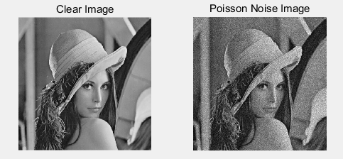 InputImg = double(imread('Lena.gif')); quantum_well_depth = 150; PhotoelectronsImg = round(InputImg*quantum_well_depth/2^8); NoiseImg = poissrnd( PhotoelectronsImg); figure(3), subplot(121), imshow(InputImg,[]), title('Clear Image') subplot(122), imshow(NoiseImg,[]), title('Poisson Noise Image') 执行效果: