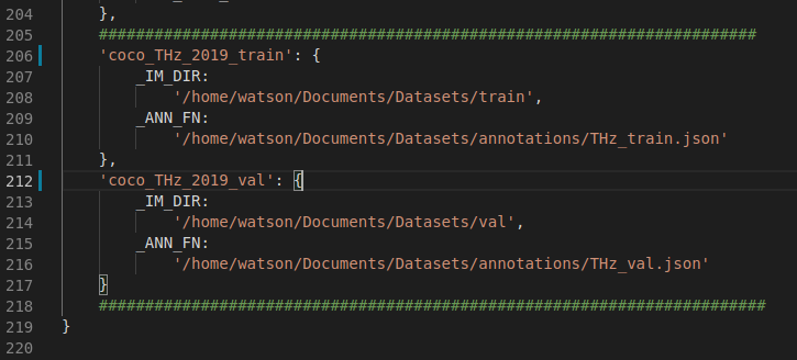 注意数据集变量的名字要包含coco_(因为这里是coco格式,其他的格式也有要求),这很重要,因为之后detectron会检查数据集的正确性。